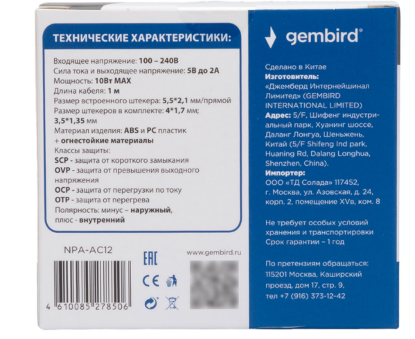 Блок питания универсальный Gembird NPA-AC12, 10Вт 3 штекера Производитель GembirdGembird Код производителя NPA-AC12 Тип аксессуара адаптер питания
