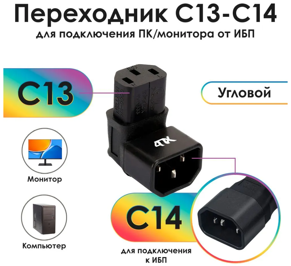 Переходник С14 / С13 угловой поможет легко решить проблему подключения питания от ИБП ноутбуков, ПК, настенных ТВ, принтеров, сканеров и других устройствк даже в труднодоступных местах. Тип разъемов: IEC 320 C14 / IEC 320.