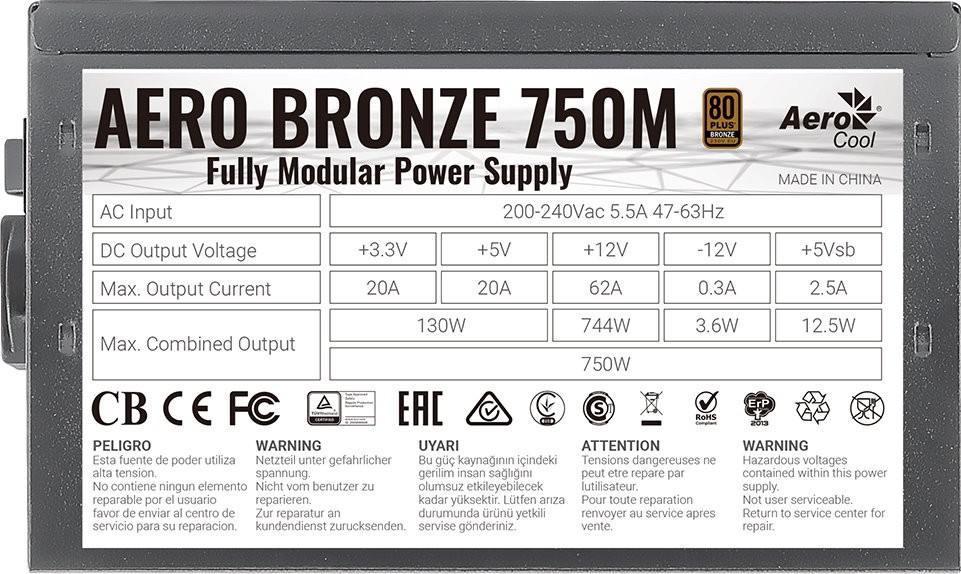 750-ваттный блок питания AeroCool AERO BRONZE 750M – надежный и энергоэффективный источник питания, предназначенный для комплектации стационарных компьютеров, ориентированных на высокий уровень производительности. Модель имеет активную систему охлаждения, главным компонентом которой является 120-миллиметровый вентилятор. Поддерживаемый диапазон напряжения в сети – от 200 до 240 В. Блок питания AeroCool AERO BRONZE 750M соответствует сертификату 80 PLUS Bronze. Есть активный корректор коэффициента мощности, оказывающий значительное влияние на величину этого показателя. Форм-фактор устройства – ATX. В комплектации модели – модульные кабеля, кабель питания и инструкция. Цвет источника питания традиционный – черный. Блок питания упакован в прочную, имеющую привлекательный внешний вид коробку.