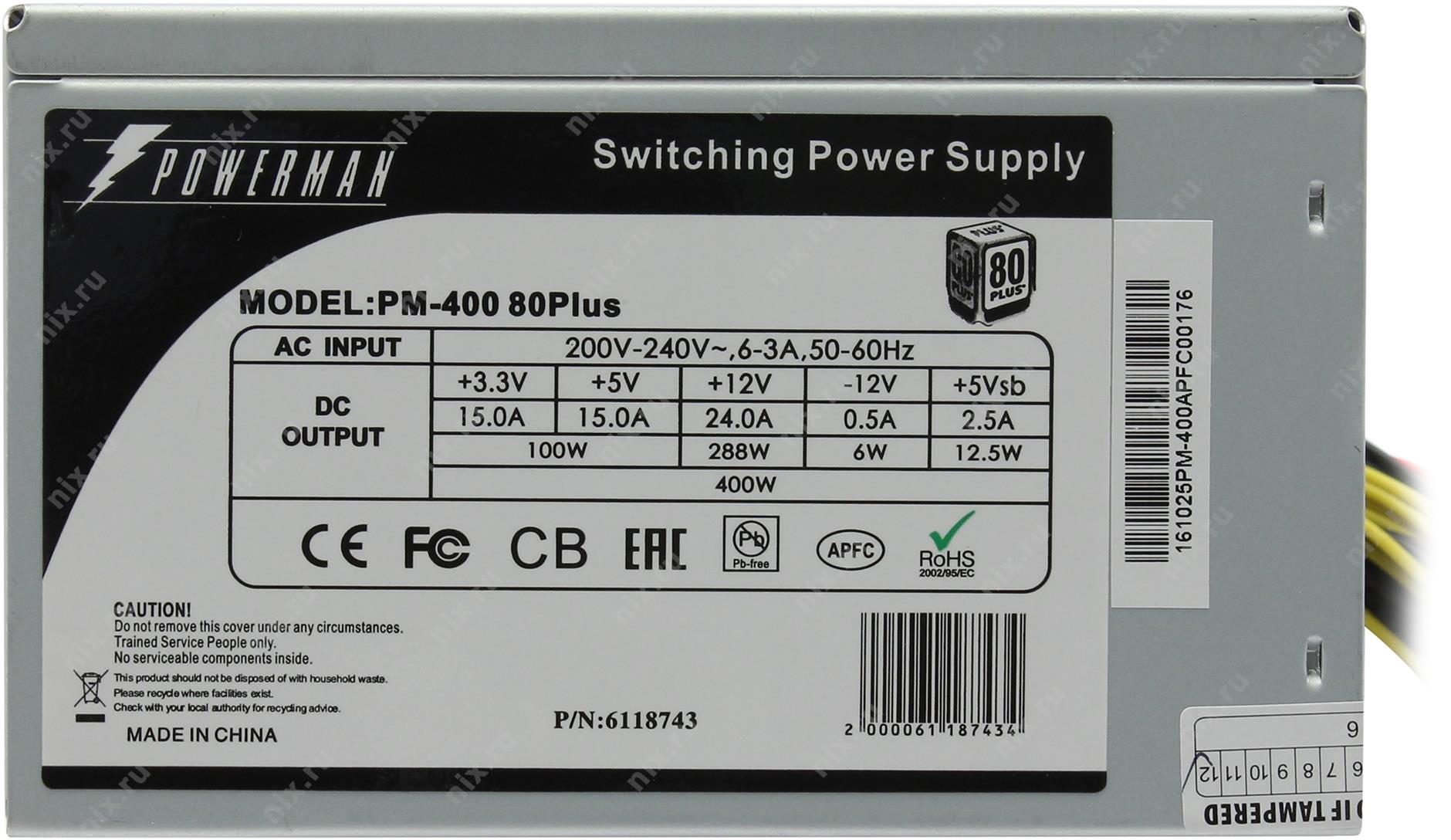Блок питания 400W Powerman PM-400 80 Plus (120mm, 24+8рin, 1*6pPCI-E, 4*Sata, 2*IDE, 1*Fdd). Блок питания Powerman 400W [PM-400 80plus] - модель начального уровня с выходной мощностью 400 Вт и хорошей энергоэффективностью, подтвержденной сертификатом 80+ Standart. Он получил неотсоединяемые кабели с разъемами питания 20+4 pin, 1x 4+4 pin CPU, 4 SATA, необходимыми для снабжения энергией основных компонентов системного блока. Наличие одного кабеля с разъемом 6 pin PCI-E позволит вам установить в системный блок видеопроцессор и подключить его к дополнительному питанию. Сфера применения компьютерного блока питания Powerman 400W [PM-400 80plus] достаточно широка: его можно приобрести для сборки ПК офисного или домашнего назначения, игровой машины средней мощности. Получившее серый металлический корпус изделие рассчитано на питание от бытовой сети и работу при входном напряжении 200-240 В. Единственный 120-миллиметровый кулер активной системы воздушного охлаждения гарантирует блоку стабильный отвод излишнего тепла.