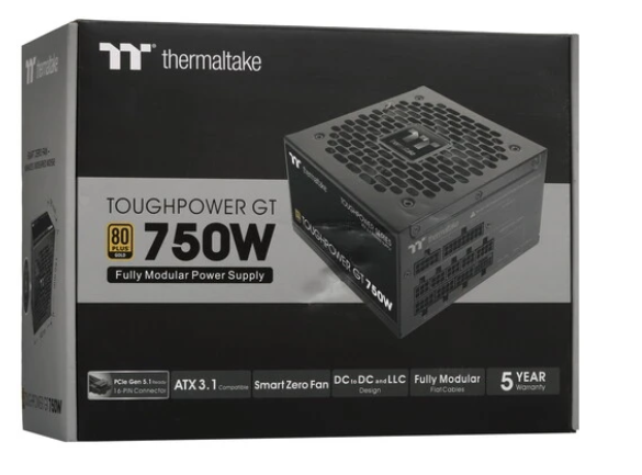 Thermaltake Toughpower GT 750W – это высокоэффективный блок питания, сертифицированный по стандарту 80+ Gold, что гарантирует эффективность работы до 90%, снижая энергопотребление и тепловыделение. Модель поддерживает стандарт ATX 3.1 и оснащена активной коррекцией мощности (APFC), обеспечивая стабильное и надежное электропитание для компонентов системы. Вентилятор диаметром 120 мм с функцией гибридного режима (FM) обеспечивает эффективное охлаждение, поддерживая тихую работу блока питания даже под нагрузкой. Блок питания оснащен широким набором разъемов для подключения различных компонентов: 24-контактный основной разъем для материнской платы, два 4+4-контактных разъема для процессора, шесть разъемов SATA для накопителей, а также четыре разъема PCIe (6+2) для подключения видеокарт. Система также поддерживает два разъема 12V (6-контактных) для обеспечения стабильного питания. Благодаря этому Thermaltake Toughpower GT 750W является отличным выбором для мощных игровых и рабочих систем с высокими требованиями к энергоснабжению.
