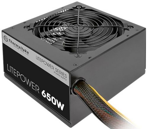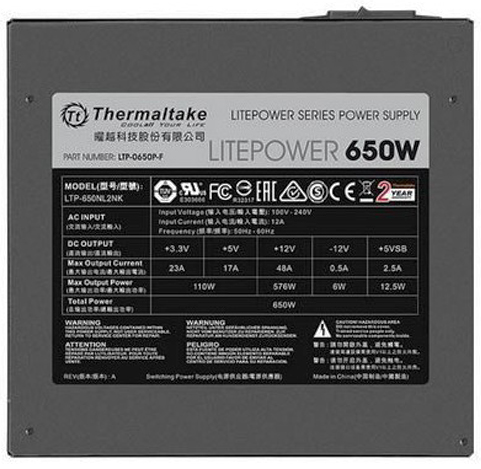Блок питания Thermaltake Litepower 650W – модель от одного из лидеров в области разработки и выпуска компьютерных источников питания. Устройство подходит для обеспечения возможности функционирования производительной системы, в том числе – игровой. Блок питания имеет активный корректор коэффициента мощности. Обеспечиваемая мощность по 12-вольтовой линии составляет 576 Вт. Номинальное напряжение питания – 230 В. Источник питания Thermaltake Litepower соответствует форм-фактору ATX. Главный разъем питания – 24-pin. Особенностью дизайна источника питания является наличие RGB-подсветки. Режимами подсветки легко управлять: для решения этой задачи используется специальная кнопка. Цвет устройства традиционный – черный. Установлен 120-миллиметровый вентилятор. В комплектацию источника питания входят крепежные винты, кабель питания и инструкция. Блок питания поставляется в коробке, имеющей привлекательный вид. Габаритные размеры устройства стандартны – 140x150x68 мм.