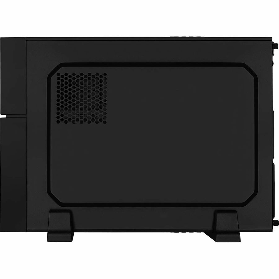 Небольшой корпус с дизайном игровой консоли Aerocool Playa Slim возможно установить не только горизонтально, но и вертикально благодаря ножкам входящим в комплект. Передняя панель с кубическим дизайном оборудована RGB лентой по центру, отсеком для 5.25\" устройств скрытый за откидывающейся заглушкой, двумя USB 3.0, разъемами для наушников и микрофона и квадратной кнопкой включения, кнопка Reset расположена ниже и меньше по размерам. Боковая часть корпуса имеет вентиляционное отверстие. Внутри корпуса можно расположить один 3.5” (без установки 5.25” устройства), либо два 2.5” устройства. Aerocool Playa Slim сможет вместить в себя только блок питания форм - фактора SFX и материнские платы форм – фактора micro – ATX и mini – ITX. Блок питания устанавливается около передней панели в верхней части, для удобства в корпусе предусмотрен удлинитель. Блок питания не входит в состав комплектации.