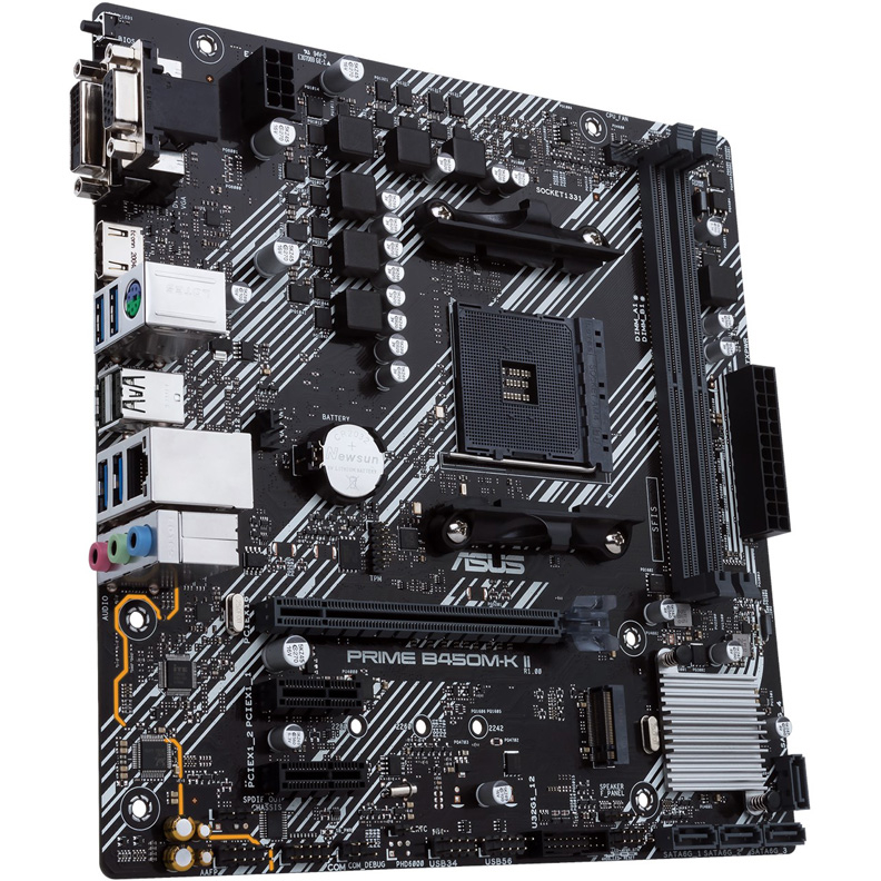 ASUS PRIME B450M-K II станет отличным фундаментом для сборки компьютера как средней, так и высокой мощности. Сокет AM4, что означает необходимость использования процессоров AMD. Устройство оснащено одним слотом расширения PCI-E x16 и двумя PCI-E x1. Ваша конфигурация подойдет для самых разнообразных задач, ведь на данной материнской плате есть все необходимое для подключения периферийного оборудования, комплектующих и других устройств. Установленный сетевой адаптер Realtek RTL8111H способен обеспечить скорость соединения до 1000 Мбит/с. Для накопителей было выделено четыре порта SATA. Также присутствует возможность установки накопителя типа M.2.