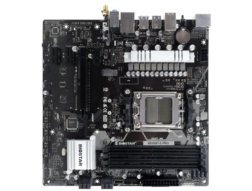 Форм-фактор: mATX. Сокет: SocketAM5; чипсет: AMD B650. Память: 4х DDR5; частотой до 5200 МГц. Слоты: PCI-E 4.0 x16 х 1, PCI-E 4.0 x1 х 3. Разъемы: M.2 х 2, Display Port х 1, HDMI х 1. Сеть: 2.5Gigabit.