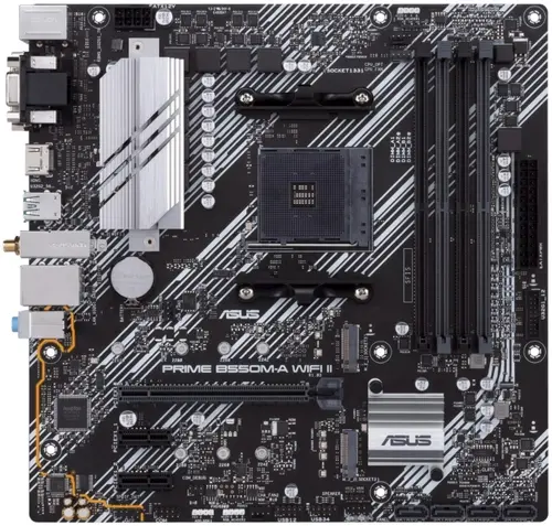 Отличающаяся эффектным дизайном материнская плата ASUS PRIME B550M-A WIFI II соответствует форм-фактору Micro-ATX. Устройство станет отличным выбором для пользователей, которые хотят собрать универсальный компьютер для дома или офиса, отличающийся компактными размерами. Плата имеет форму квадрата со сторонами 244 мм. Процессорный сокет – AM4. Плата совместима с процессорами AMD с ядрами Matisse, Renoir и Vermeer. Максимально допустимый объем оперативной памяти – 128 ГБ. Материнская плата ASUS PRIME B550M-A WIFI II имеет слот PCI-E x16, в который можно установить производительную видеокарту. Также в наличии 2 слота PCI-E x1, которых наверняка хватит для размещения необходимых контроллеров и других плат расширения. Важным для большинства пользователей свойством устройства станет наличие интегрированных адаптеров Wi-Fi и Bluetooth. Скорость встроенного сетевого адаптера – 1 Гбит/с. Формат интегрированного звука традиционный – 7.1. В оснащение платы входят 2 разъема M.2, рассчитанные на установку SSD накопителей. Особенность модели – LED-трассировка зоны аудиоподсистемы.