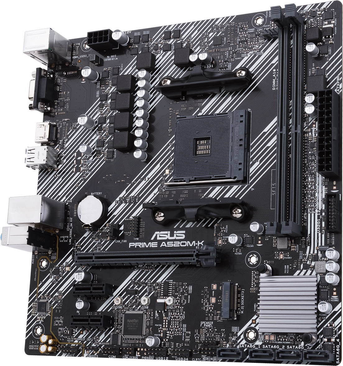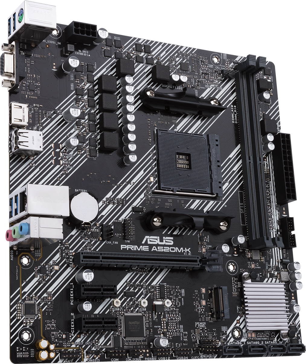 Пусть скромные размеры платы ASUS PRIME A520M-K не вводят вас в заблуждение. Этак кроха способна показать одно из лучших сочетание цены, качества и производительности. Устройство выполнено в формфакторе mATX, поэтому без проблем станет в любой корпус. Под оперативную память выделено 2 слота DDR4 с максимальным объемом 64ГБ. Имеются четыре порта SATA 6Gb/s. Не забыл производитель и про популярные сейчас SSD - слот М.2 на месте. ASUS PRIME A520M-K имеет все шансы стать надежной основой для вашей рабочей станции.