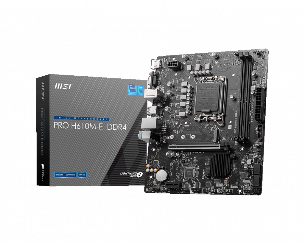 Материнская плата MSI PRO H610M-E DDR4 станет надежным решением для сборки офисной рабочей станции. Она выполнена в форм-факторе Micro-ATX и содержит в своей основе чипсет Intel H610 с процессорным разъемом LGA 1700. В оснащение платы входят 2 слота под размещение до 64 ГБ оперативной памяти, 4 разъема SATAIII и 1 разъем M.2 под установку накопителей, по одному слоту расширения PCI-E x16 и PCI-E x1.