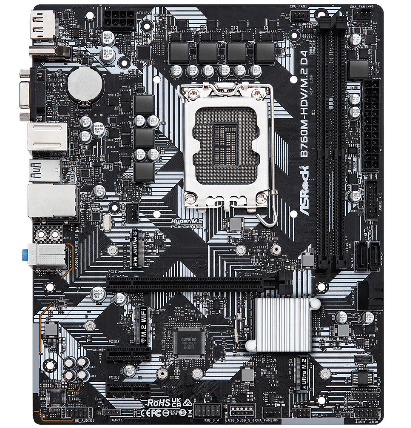 ‧Поддержка 14th, 13th & 12th-е поколение Intel® Core™ (LGA1700) 5+1+1 Power Phase Поддержка DDR4 5333МГц (OC) 1 PCIe 4.0 x16, 2 PCIe 3.0 x1, 1 M.2 Key E для поддержки WiFi Устройство графического вывода данных: HDMI, DisplayPort, D-Sub Realtek ALC887/897 7.1-канальный HD-кодек Codec 4 SATA3, 1 Hyper M.2 (PCIe Gen4x4), 1 Ultra M.2 (PCIe Gen3x4 & SATA) 1 USB 3.2 Gen1 Type-C (задних), 5 USB 3.2 Gen1 Type-A (3 Rear, 2 передних), 5 USB 2.0 (2 Rear, 3 Front) Realtek 1G LAN Поддержка Автоустановщик драйверов ASRock