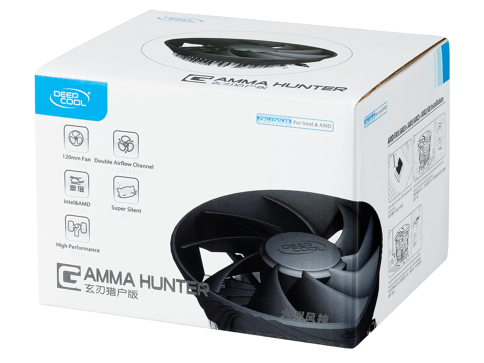 Устройство охлаждения(кулер) Deepcool GAMMA HUNTER.Основные характеристики: Тип охлаждения: активное воздушное. Тип подшипника вентилятора: Hydro Bearing. Количество вентиляторов: 1. Диаметр вентилятора: 120 мм. Уровень шума вентилятора: 21дБ. Потребляемая мощность вентилятора: 95 Вт. Размеры кулера: 121x63.5x124мм. Материал радиатора: алюминий. Потребляемая сила тока вентилятора: 0.12 A. Совместимость: SocketFM1, SocketFM2, SocketFM2+, SocketAM2, SocketAM3, SocketAM3+, SocketAM4, Socket 1150, Socket 1151, Socket 1155, Socket 1179. Предназначено для ЦП. Тип крепления охлаждающего устройства к МП: на винтах