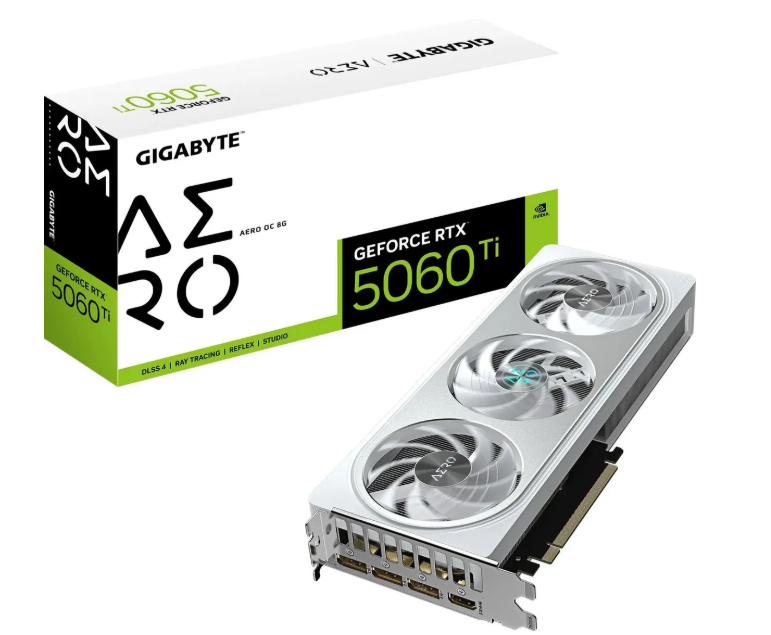 Видеокарта 8Gb Gigabyte GV-N506TAERO OC-8GD (RTX5060Ti) GDDR7 128bit HDMI DP Видеочипсет: NVIDIA GeForce RTX 5060TI, 2647 МГц; 5 нм Память: 8 ГБ GDDR7, 28000 МГц; 128 bit Интерфейс: PCI-E 5.0 Разъемы: Display Port х 3, HDMI х 1 Питание: 8 pin, рекомендовано 650 Вт Охлаждение: активное; WINDFORCE; с тепловыми трубками Особенности: трассировка лучей; поддержка DLSS; с подсветкой