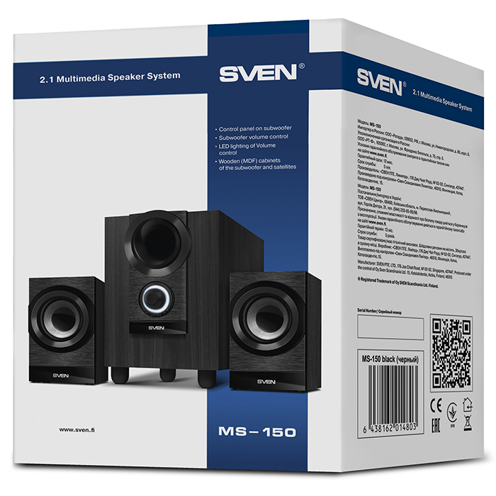 Колонки SVEN MS-150 великолепный вариант для домашнего использования. Колонки, включающие в себя сабвуфер и 2 сателлита, изготовлены из MDF. Эта конструктивная особенность способствует высокому качеству звучания музыки во всем диапазоне частот. Общая выходная мощность системы составляет 15 Вт: колонки будут эффективны в помещении любого объема. Колонки SVEN MS-150 подключаются к источникам звука с помощью разъемов RCA. Модель может подключаться к мобильным и стационарным компьютерам, бытовой аудиотехнике, аудиоплеерам и другим устройствам. На тыльной стороне сабвуфера, помимо кнопки питания, расположен регулятор басов. К регулятору громкости организован более простой доступ: он расположен на передней панели сабвуфера. Этот регулятор имеет стильную светодиодную подсветку. Для питания колонок используется бытовая электрическая сеть. Акустическая система имеет черный цвет, который хорошо подойдет к интерьеру подавляющего большинства комнат и других помещений. В комплект поставки колонок, помимо аудиокабеля, входит руководство по эксплуатации.