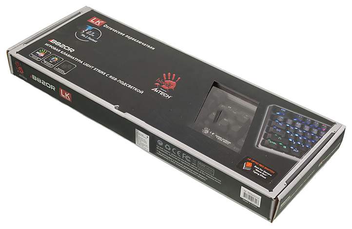 Клавиатура A4Tech Bloody B820R Blue S поможет вам получить максимум удовольствия от игрового процесса. Она проектировалась для геймеров. Удается комфортно управлять персонажем, быстро действовать в различных ситуациях. A4Tech Bloody B820R Blue S оснащается 104 клавишами. Они механического типа, используются элементы Light Strike. Кнопки обладают четким ходом, быстрый отклик будет важен во время игр. Есть подсветка клавиш. Благодаря ей можно пользоваться клавиатурой при отсутствии источников света в помещении. Подсветка многоцветная, удается выбрать подходящий вариант и выполнить настройку. Основной цвет черный. В комплекте поставляются сменные оранжевые клавиши. При необходимости можно легко выделить их на фоне других элементов. Демонтаж кнопок происходит при помощи пинцета, он присутствует в коробке. Производитель реализовал защиту от проливания жидкости. Попавшие на клавиатуру напитки не станут причиной поломки. Выполнена конструкция из качественного пластика. Подключение происходит через кабель с длиной 1.8 метра. С ПК клавиатура соединяется через USB, по шине поступает питание.