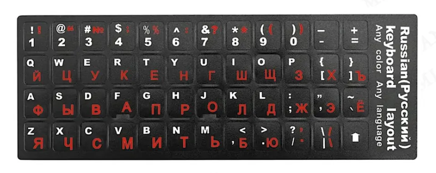 Наклейки на клавиатуру с русскими буквами (RU/ENG), красно-белые.