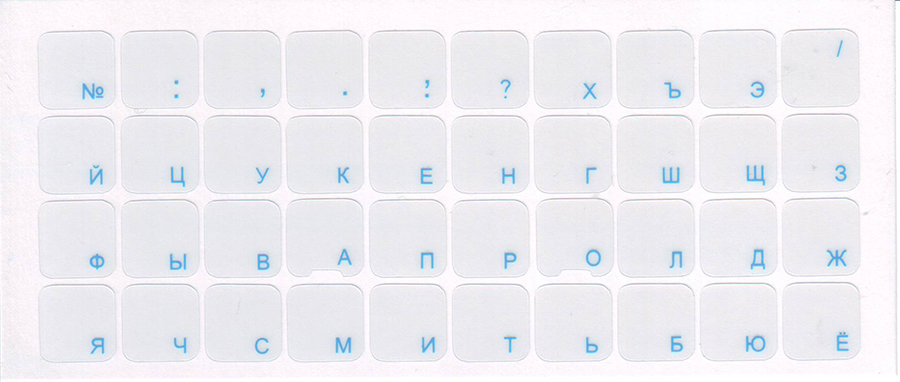 Наклейки на клавиатуру с русскими буквами — это прозрачный фон и синие символы. Они предназначены для основных клавиш и помогают русифицировать ноутбук, заменить заводской шрифт или сохранить поверхность клавиш в первозданном виде. В наборе 48 разделённых стикеров.