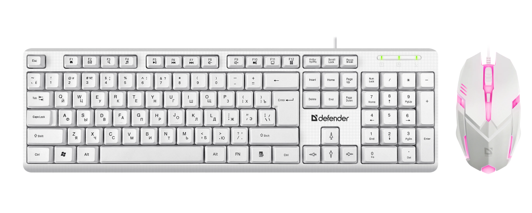 Комплект проводной (клавиатура+мышь) Defender Motion C-977 White Тихий ход клавиш обеспечивает практически бесшумную работу; Увеличенная площадь клавиш-модификаторов (Ctrl, Shift), клавиш Enter и BackSpace; Полноразмерная раскладка клавиш; Угол наклона клавиатуры регулируется с помощью ножек; Резиновые ножки предотвращают скольжение по поверхности стола; 3 режима разрешения мыши 800/1200/1600 dpi; Радужная подсветка; Рифленое колесо прокрутки; Легкая установка. Для работы не нужны драйверы; Управление мультимедийными программами: Активируются клавишей FN; Удобная симметричная форма мыши: Удобна для работы любой рукой
