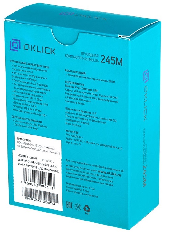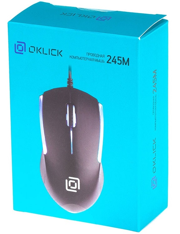 Мышь проводная Oklick 245M является простым по конструкции и очень надежным манипулятором, который будет полезен вам как в офисе, так и дома. Разрешение оптического датчика, которым оборудована мышь, равно 1000 dpi. Этот параметр свидетельствует о необходимой для работы в подавляющем большинстве программ точности позиционирования. Для подключения мыши к стационарным и мобильным компьютерам используется USB-интерфейс. Длина кабеля равна 1.5 м. Мышь проводная Oklick 245M имеет корпус черного цвета, украшенный светлыми вставками. Есть возможность скроллинга. Модель очень надежна: ресурс нажатий ее кнопок приравнивается к 3000000 нажатий. Важным преимуществом модели является наличие разноцветной подсветки. Мышь упакована в коробку, имеющую эффектный вид. В комплекте есть подробное руководство пользователя.