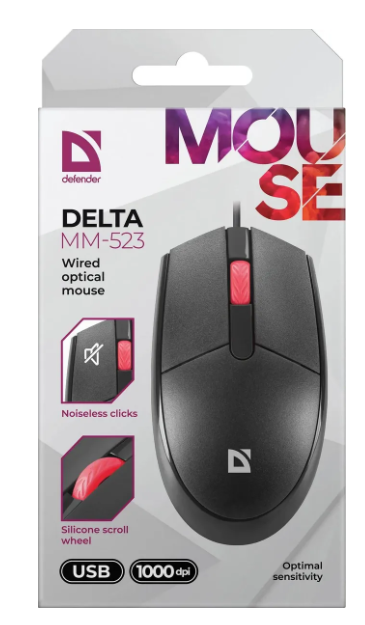 Мышь проводная Defender Delta MM-523 Black Технология оптическая Тип соединения мыши проводная Интерфейс подключения USB Подключение по USB есть Длина провода 1.8 м Особенности Чувствительный оптический сенсор,бесшумное нажатие кнопок,силиконовое колесо прокрутки, легкая установка, для работы не нужны драйверы не нужен коври, тонкий и гибкий кабель отличается прочностью и надежностью