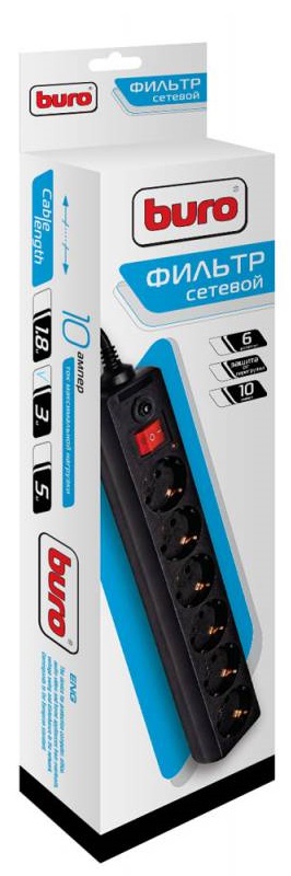 Удлинитель с сетевым фильтром 6х3м с заземл. ПВС 3х0.75 черн. 600SH-3-B 3m BURO 992272 – электроустановочный аксессуар. Представляет собой трехжильный проводник сечением жилы 0,75 кв.мм. Длина шнура составляет 3 м, с розеткой типа \"евро\". Количество гнезд для подключения: 6 шт. Цвет: черный. Представляет собой средство подключения нескольких приборов в сеть. Предохраняет бытовые приборы и компьютерную технику от перепадов напряжения в сети и короткого замыкания, стороннего воздействия электромагнитных помех и импульсных скачков напряжения на входе. Производитель: BURO.
