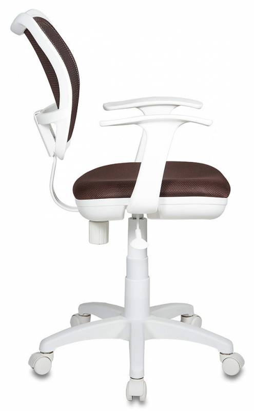 Эргономичное детское кресло Бюрократ CH-W797/BR/TW-14C c сетчатой обивкой спинки коричневого цвета, белым каркасом, Т-образными белыми пластиковыми подлокотниками, регулировкой высоты (газлифт), пружинно-винтовым механизмом качания спинки, ограничением по весу: 120 кг.