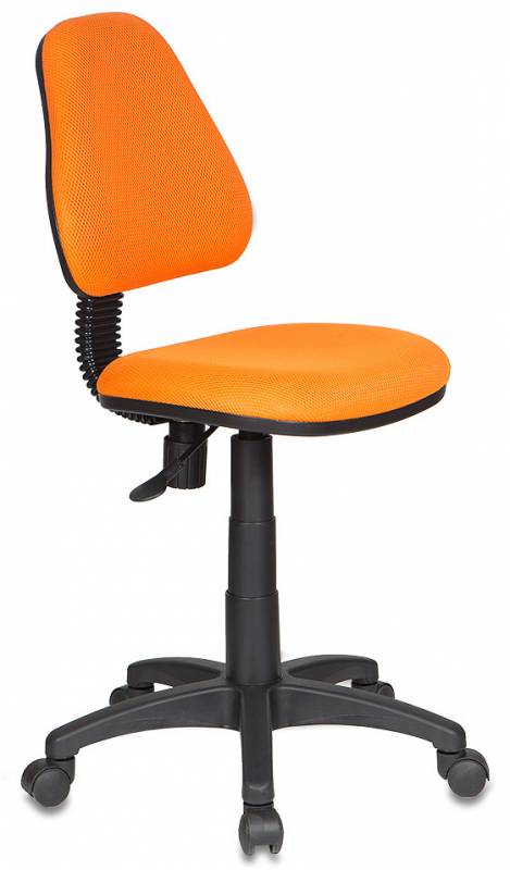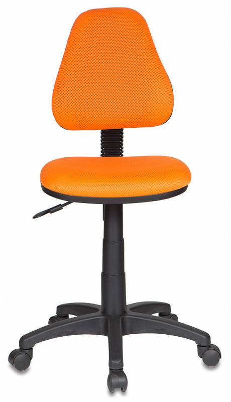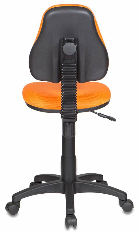 Детское кресло Бюрократ KD-4/TW-96-1 c обивкой из ткани оранжевого цвета, черным каркасом, регулировкой высоты (газлифт), ограничением по весу: 100 кг. Среди отличительных особенностей данной модели являются: пружинно-винтовой механизм качания спинки, сиденье имеет 2 варианта сборки (перемещается относительно платформы), за счет этого меняется глубина сиденья. Спинка пружинит и перемещается вверх-вниз по опоре. Присутствует регулировка под вес.