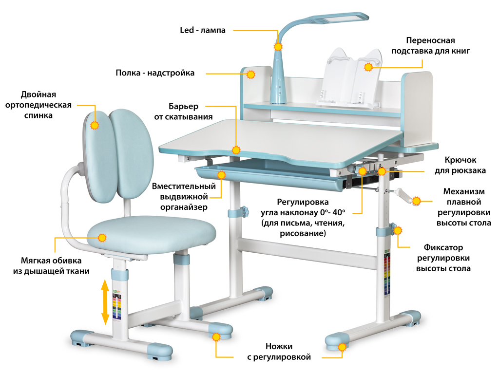 Отличительной особенностью этой модели является мягкое кресло, оббитое дышащей мебельной тканью, что повышает комфорт ребенка. Двойная ортопедическая спинка прилегает к спине, минимизирует нагрузку и со временем формирует правильную осанку школьника. Максимальная нагрузка – до 60 кг.На полке-надстройке можно поставить светодиодую лампу, переносную подставку для книги, учебники или монитор.Гибкая светодиодная лампа имеет три режима яркости и три температурных режима освещения (теплый, холодный, дневной). Настраивайте лампу в зависимости от вида деятельности ребенка.Регулировка лампы осуществляется с помощью сенсорных кнопок. Лампа работает от сети. В комплекте предусмотрен блок питания.Переносная подставка из прочного пластика подстраивается под размер учебника и тетради, может изменять угол наклона и имеет зажимы для удобства.Столешница изменяет угол наклона до 40 градусов, поэтому ее можно использовать для рисования. Закрепить угол наклона помогут прочные фиксаторы. Специальный зазор на столешнице позволяет безопасно регулировать столик даже детьми младшего возраста.Высота столика изменяется механизмом плавной регулировки специальной ручкой, позволяющей с легкостью устанавливать парту в соответствии с ростом ребенка. Кресло регулируется по высоте и фиксируется винтами. На мощных металлических ножках есть мебельные опоры, помогающие установить комплект на неровных поверхностях.Под столешницей расположен вместительный органайзер для тетрадей и канцелярии, созданный из безопасного и прочного ABS-пластика.На столешнице предусмотрен небольшой барьер от скатывания предметов, а выемка обеспечит ребенку максимальное удобство во время письма.Приятным бонусом станет наличие съемного металлического крючка для размещения портфеля.