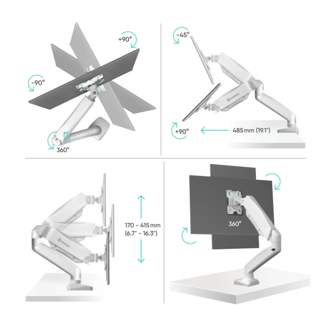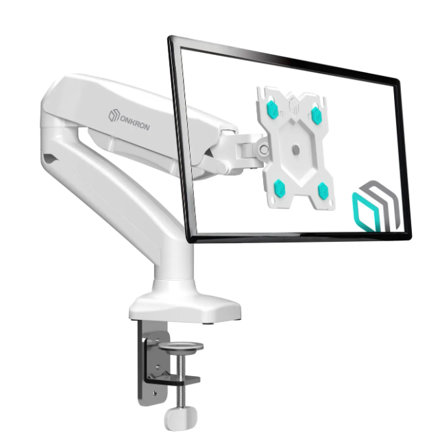 Для установки оборудования на столе можно использовать кронштейн для мониторов Onkron G80W. Предназначен он для монтажа устройств с диагональю от 13\" до 32\". Легкая, надежная конструкция выполнена в белом цвете, что позволит гармонично вписать ее в любой интерьер. Она изготовлена в поворотно-наклонном формате, обеспечивающем угол наклона экрана в границах от +90 до -45 градусов. Кронштейн для мониторов Onkron G80W предусматривает возможность поворота экрана на 360 градусов. Регулировка производится плавно, без рывков, обеспечивая комфортность работы за счет применения механизма с возвратной пружиной и газовым амортизатором. Кронштейн соответствует стандарту VESA MIS-D, для монтажа мониторов используются специальные крепления VESA размерами 75х75 и 100х100 мм.