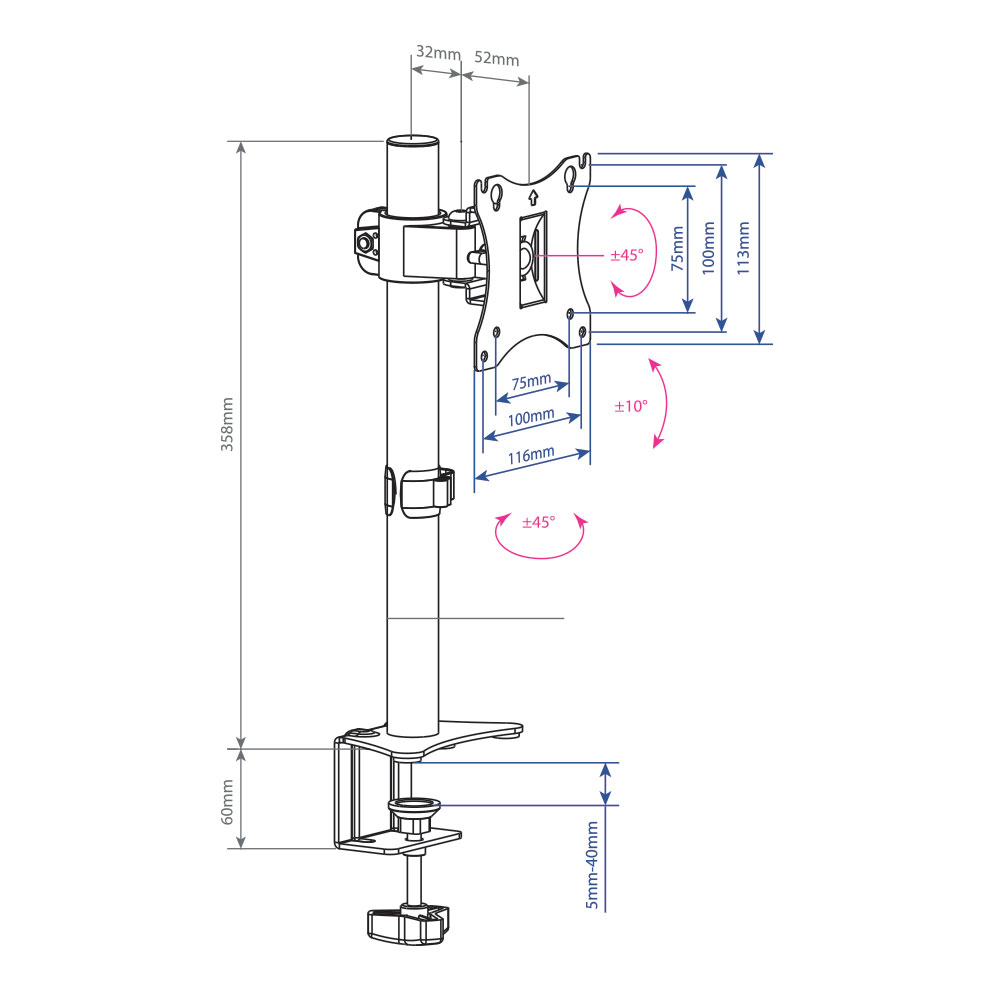Универсальное настольное крепление. Надежная стальная конструкция - максимальная нагрузка 7 кг. Монитор на кронштейне можно: вращать на ±45° в горизонтальной плоскости, наклонять вверх и вниз, и поворачивать влево и вправо. Регулируемое по высоте крепление. Кабель-канал.