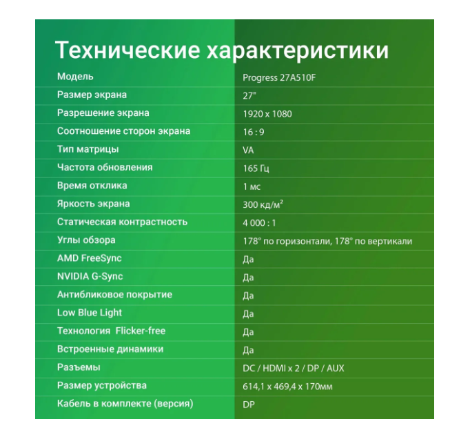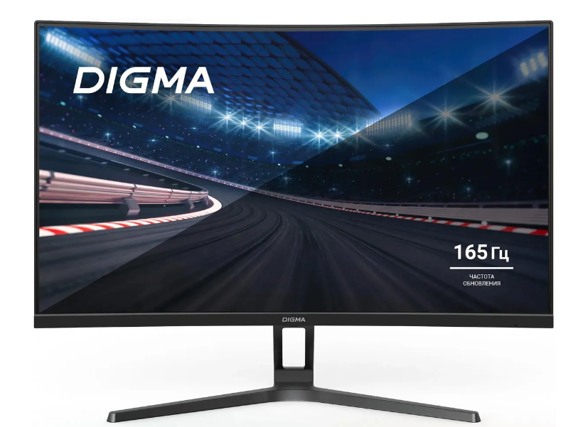 Монитор 27'' Digma Overdrive 27A510F (VA 1920x1080 1ms 165Hz HDMI DP) black Экран: 27 \", 1920x1080, 16:9, VA, 165 Гц, 300 кд/м2, 1 мс, AMD FreeSync, NVIDIA G-Sync, изогнутый Контрастность: статическая 4000:1, динамическая 10000000:1 Разъемы: Display Port х 1 шт, HDMI х 2, выход на наушники Мультимедиа: встроенные динамики Блок питания: внешний ПоддержкаHDTV FULL HD (1080p)