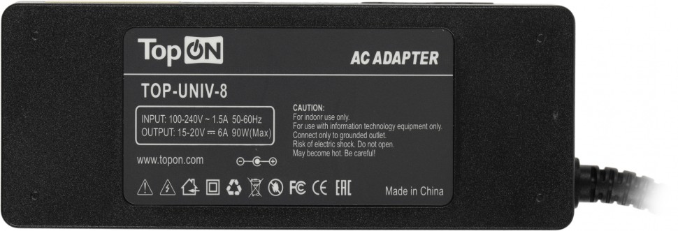 Блок питания TopON 102926 90W — универсальный аксессуар для ноутбуков. Основные характеристики: Материал корпуса: пластик. Цвет: чёрный. Выходное напряжение: 15–20 В. Входное напряжение: 100–240 В. Защита от короткого замыкания: есть. Длина кабеля: 1,7 м. Выходная мощность: 90 Вт. Выходная сила тока: 6 А. Количество сменных штекеров: 8. Блок питания подходит для ноутбуков брендов ACER, ASUS, DELL, FUJITSU, HP, LENOVO, SAMSUNG, SONY и TOSHIBA