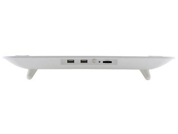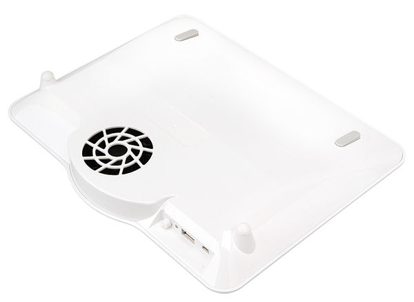 Поверхность проходит двойную обработку: с помощью алмазного режущего инструмента, а также пескоструйную с последующим анодированием. Это гарантирует прочность, высокую теплопроводность и устойчивость к различного вида механическим воздействиям. Также в конструкции продумана резиновая полоска, которая предотвращает соскальзывание ноутбука и направляет поток нагретого воздуха в противоположную сторону от пользователя. Эргономичная форма обеспечит максимальное удобство в процессе работы, а наличие и одновременное функционирование двух радиальных вентиляторов позволит создать мощный воздушный поток и эффективный отвод тепла. Корпус подставки выполнен из пластика. В нижней и верхней частях рабочей поверхности размещаются полоски из резины, что гарантирует устойчивость и исключают вероятность скольжения. Центральная часть рабочей поверхности выполнена из листа перфорированного алюминия, который крепится к подставке с помощью винтов. Наличие 724х равномерно расположенных вентиляционных отверстий с высокой пропускной способностью содействует распределению потока холодного воздуха и тем самым обеспечивает эффективный теплообмен во время работы. Имеется также регулятор скорости вращения. При этом подставка является достаточно бесшумным устройством (на низких оборотах вентилятора) и дает возможность эксплуатации в публичных местах (библиотеки, различного рода учреждения), где условия работы требуют тишины. Продумано наличие питание от USB, что в данном случае избавляет от необходимости подключать устройство к сети, это можно сделать непосредственно к ноутбуку, а также имеется дополнительный USB 2.0 порт для подсоединения различных периферийных устройств. Устройство комплектуется кабелем USB.