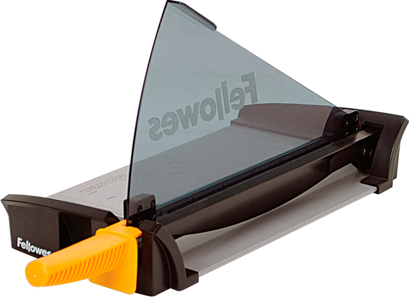 Сабельный резак Fellowes Fusion A4 оборудован ручной системой прижима и способен разделить стопку до 10 листов формата А4 при плотности бумаги до 80 г/м². На нём установлен защитный экран, который защищает от случайных прикосновений пользователя к ножу во время работы. Устройство предназначено для работы с обычной бумагой, пленкой и картоном.