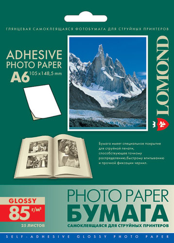 Бумага Lomond [10x15см] самоклеящаяся фотобумага, глянцевая, 85гр/м2, 25л, неделен. (105мм х 148мм)