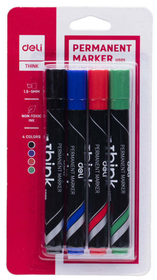 Набор маркеров перманентных Deli EU10101 Think со скошенным наконечникников. В наборе четыре цвета.