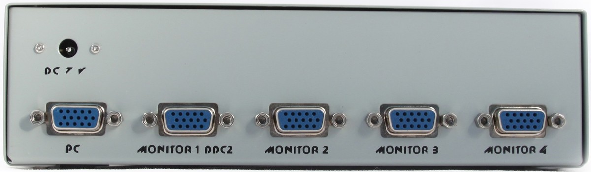 Разветвитель VCOM предлагает решение для одновременной трансляции видеосигнала сразу на четыре монитора через VGA-порты. Для подключения к электросети служит стандартный внешний адаптер. Есть индикатор питания и маркировка подключений на задней панели. Максимальное разрешение на выходе составляет 1920×1440 пикселей. VCOM позволяет передавать качественную картинку с помощью D-Sub-интерфейса видеокарты, то есть вы без труда организуете мультимедийный комплекс в домашних условиях или небольшом магазине.