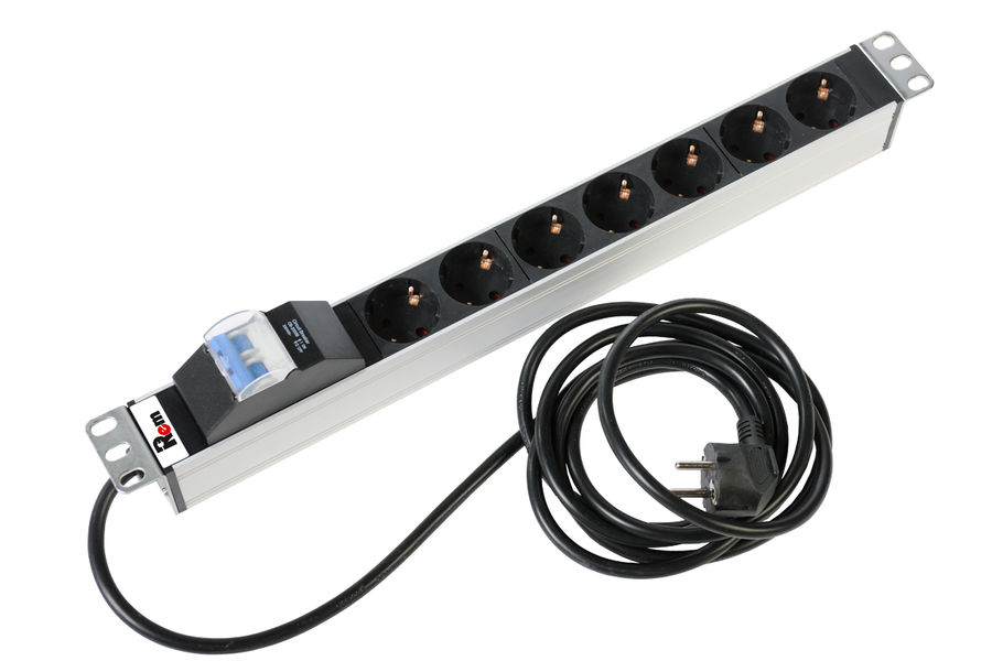 Блок розеток имеет семь портов стандарта Schuko, выполнен в анодированном алюминиевом корпусе. Розетки расположены под углом 45°, для удобного подсоединения коленчатых штекеров. Блок силовых розеток имеет фильтр защиты, на лицевой части блока установлен индикатор питания. Кабель питания обладает длиной 3 метра. Совместим со всеми линейками 19” монтажного оборудования. Поставляется в индивидуальной упаковке с комплектом крепежа.