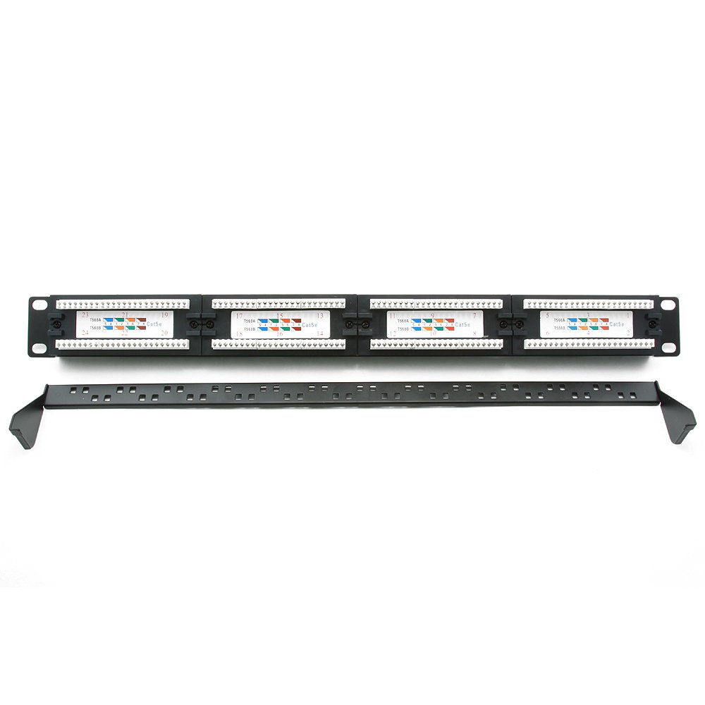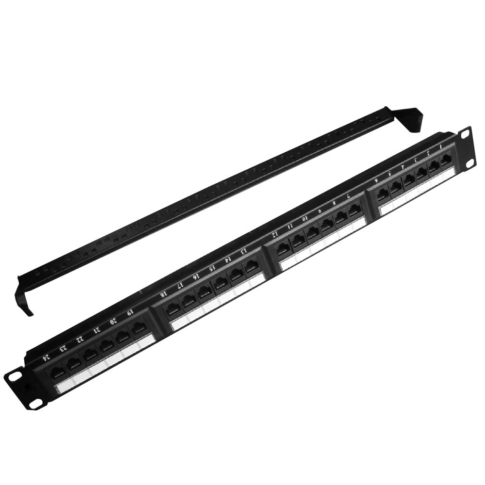 Патч-панель для монтажа в 19″ стойку, неэкранированная, категория 5e, 24 порта RJ45, высота 1U Позолоченные контакты. Съемная планка-органайзер для кабельной поддержки. Инструмент для заделки типа 110. Заменяемые бумажные этикетки Габ. размеры: 483x47x86 мм (ШхВхГ). Вес: 0.8 кг Комплектация: патч-панель, задний органайзер, 4 пластиковые стяжки, 4 винта М6, 4 гайки М6, 4 шайбы