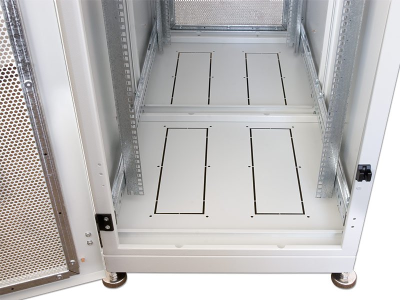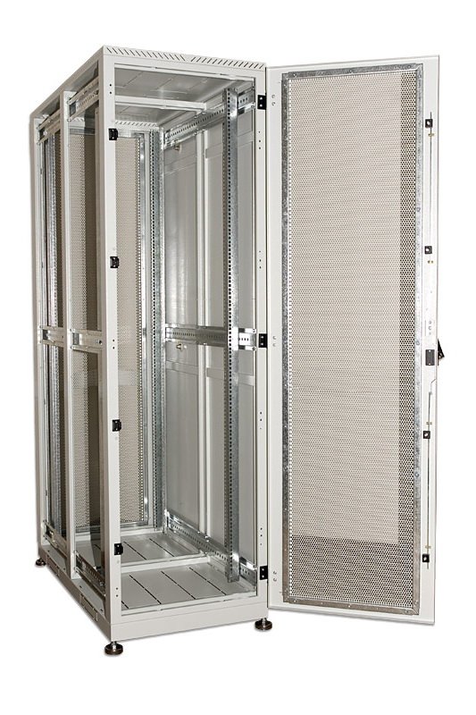 Шкаф телекоммуникационный ШТК-СП предназначен для размещения электронного и электротехнического оборудования , аппаратуры телекоммуникационных систем, передачи и хранения информации в закрытых помещениях. Вид климатического исполнения О4.2 по ГОСТ 15150 с предельными рабочими температурами воздуха при эксплуатации от плюс 1°С до плюс 45°С и относительной влажности не более 80 при 20?С. Шкаф поставляется в полностью собранном виде с установленными металлическими дверями, задней и боковыми стенками, имеет степень защиты, обеспечиваемую оболочкой, IP20. Имеется возможность установки панелей систему несущих конструкций 482б6 мм по ГОСТ 28601.1 (19” по МЭК 297). Шкаф имеет две массивные сварные рамы, соединенные комплектом швеллеров, что обеспечивает повышенную жесткость конструкции. В зависимость от комплектации шкаф может поставляться с передней и задней перфорированными дверьми (одностворчатыми или двухстворчатыми) усиленными боковыми стенками. Двери фиксируются замками с ручкой. Возможно установка двери как с левой, так и справой стороны. Двери имеют возможность быстрого безинструментального снятия и установки. Боковые проемы закрываются двумя боковыми стенками. Стенки фиксируются точечными замками. Крыша имеет заглушенные отверстия под кабельные вводы. Так же в крыше предусмотрены отверстия для крепления кабельных каналов фиксатором КГЛ (в комплект поставки не входит). Нижняя часть – полая, обеспечивающая хороший доступ к коммутациям в подготовленном помещении. В нижней части шкафа можно установить панели различного назначения (например, фальшпол ОС-ШТК-СП-х). Так же в нижней части шкафа установлены регулируемые опоры и транспортировочные ролики для перемещения шкафа без оборудования. Предусмотрено крепление основания шкафа к полу (кронштейны в базовой поставке крепят шкаф к деревянному поддону). Доступ для монтажа, коммутации и обслуживания оборудования возможен с четырех сторон: через боковые стенки, переднюю и заднюю двери. В базовой комплектации шкаф имеет 4 оцинкованные вертикальные направляющие, регулируемые по глубине. Предусмотрена система заземления (провода для заземления всех деталей шкафа входят в комплект поставки). Тыльная часть шкафа стандартно комплектуется вертикальными кабельными органайзерами шириной 116 мм, перфорированными для удобства размещения блоков розеточных (PDU), укладки и фиксации кабелей. В организаторах предусмотрена система отверстий для быстрой безинструментальной установки и снятия различных типов блоков и оборудования.