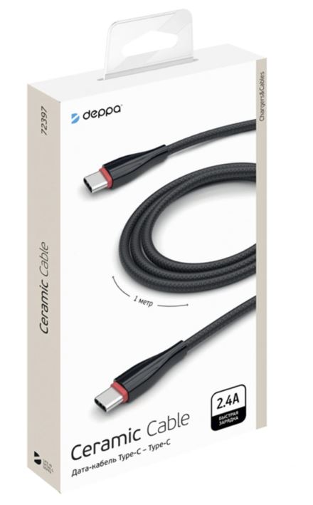 Кабель USB-C < - > USB-C, 1.0м, Deppa Ceramic, черный
