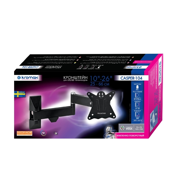 Крепление для ТВ и мониторов Kromax Casper-104 это наклонно-поворотный кронштейн настенного крепления для LED/LCD-телевизоров весом до 15 килограмм. Диагональ экрана варьируется от 10 до 26 дюймов (до ~ 66 см). Механизм конструкции позволяет менять расстояние от стены до телевизора в пределах 57 410 мм. Универсальная конструкция модели Kromax Casper-104 допускает поворот влево и вправо вокруг вертикальной оси на 180° и регулировку угла наклона вверх и вниз (от +5°до 15°), что обеспечивает выгодный угол обзора с любой точки помещения. Размер отверстий крепления 75x75 и 100x100 по стандарту VESA. При монтаже поможет встроенный водяной уровень и съемная монтажная пластина. Специальный канал для кабеля и декоративные накладки не нарушат гармонии дизайна Вашего помещения.