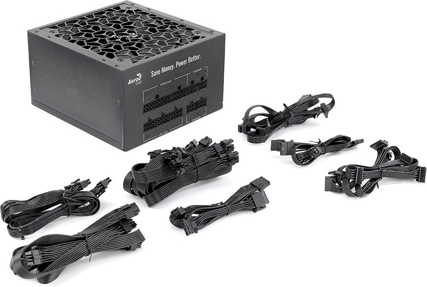 750-ваттный блок питания AeroCool AERO BRONZE 750M – надежный и энергоэффективный источник питания, предназначенный для комплектации стационарных компьютеров, ориентированных на высокий уровень производительности. Модель имеет активную систему охлаждения, главным компонентом которой является 120-миллиметровый вентилятор. Поддерживаемый диапазон напряжения в сети – от 200 до 240 В. Блок питания AeroCool AERO BRONZE 750M соответствует сертификату 80 PLUS Bronze. Есть активный корректор коэффициента мощности, оказывающий значительное влияние на величину этого показателя. Форм-фактор устройства – ATX. В комплектации модели – модульные кабеля, кабель питания и инструкция. Цвет источника питания традиционный – черный. Блок питания упакован в прочную, имеющую привлекательный внешний вид коробку.