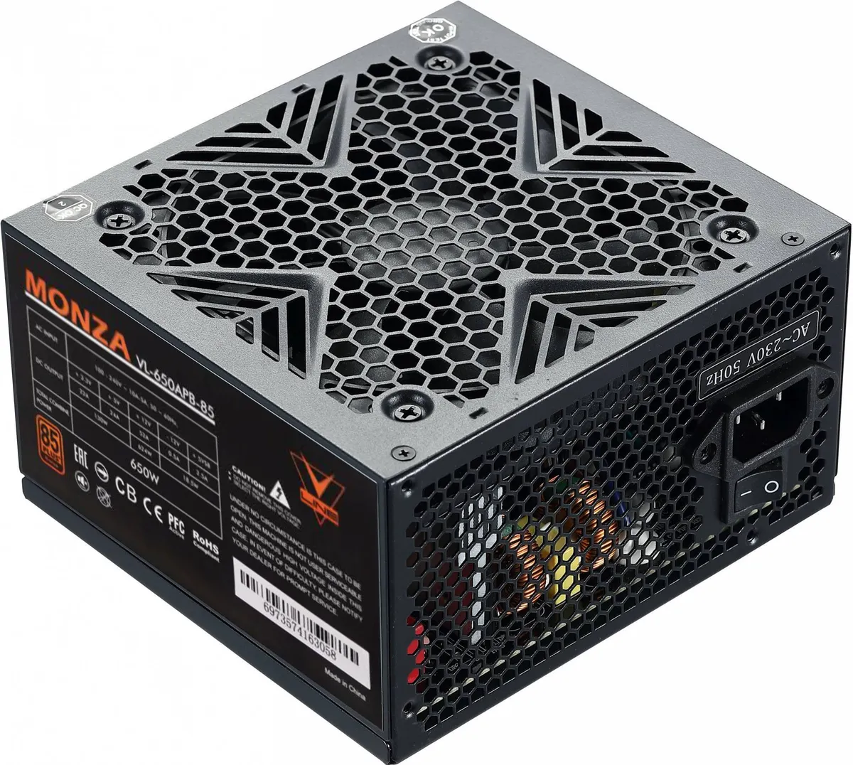 Блок питания Formula MONZA VL-650APB-85 черного цвета, ATX, мощность 650W, стандарт 80+ bronze, коррекция мощности APFC, питание МП (24+4+4pin), питание видеокарты 4х(6+2) pin, 7xSATA, размер вентилятора 120мм, RTL (VL-650APB-85)