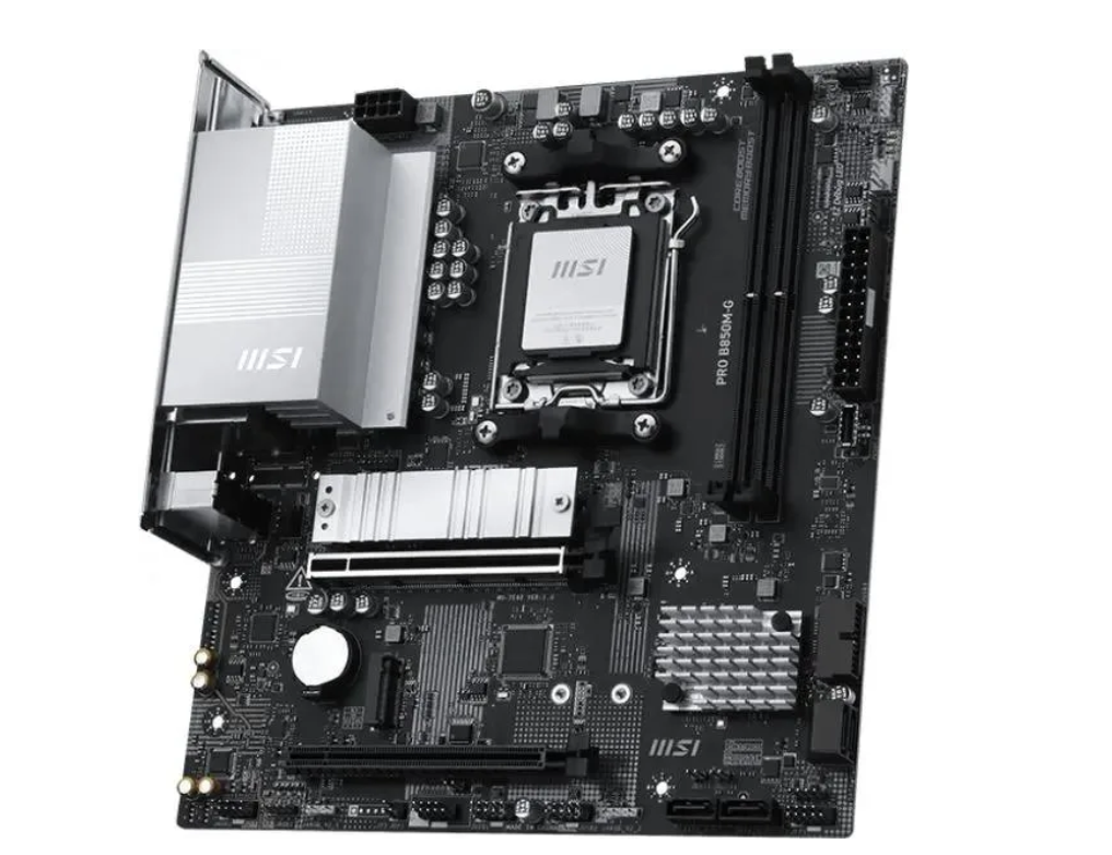 Материнская плата Socket AM5 MSI PRO B850M-G (B850) 2*DDR5 HDMI DP mATX — материнская плата формата Micro-ATX (mATX) для платформы AMD AM5. Поддерживает процессоры AMD Ryzen 9000, 8000 и 7000 серий. Особенности: два слота DDR5 DIMM, поддерживающие до 128 ГБ оперативной памяти в двухканальном режиме; четыре порта SATA 6 Гбит/с и два слота M.2; один из слотов M.2 поддерживает высокоскоростной интерфейс PCIe 5.0 x4, другой — PCIe 4.0 x4.