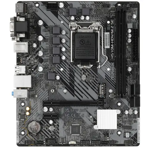 Материнская плата ASRock H510M-HDV/M.2 SE ‒ важный компонент системы ПК, который соединяет все составляющие с процессором. Она соответствует форм-фактору Micro-ATX и предполагает стандартное расположение элементов. Особенность конструкции в уменьшенных зазорах между слоями, что защищает компонент от электрических замыканий при воздействии влаги. Для двухканальной памяти DDR4-2933 МГц предусмотрено два слота. Максимальный объем планок памяти составляет 64 ГБ. Плата совместима с процессорами Intel с архитектурой ядер Comet Lake или Rocket Lake и поддерживает подключение через сокет LGA 1200. В ее основе лежит микросхема Intel H470, что обеспечивает безопасность компьютерной системы в корпоративных сетях. Для подключения видеокарты на ASRock H510M-HDV/M.2 SE предусмотрен разъем PCI-Ex16. Он обеспечивает быстрое считывание данных. Через слот M.2 происходит подключение SSD-дисков. На плате расположены 4 слота SATA для соединения с жесткими дисками.