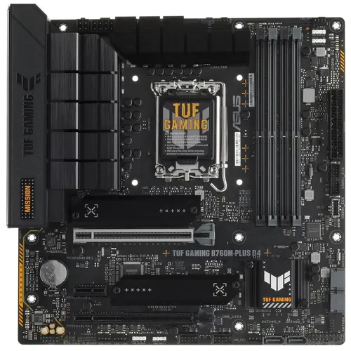 Материнская плата ASUS TUF GAMING B760M-PLUS D4 выполнена в стиле устройств серии TUF. Внешне она примечательна массивными радиаторами отвода тепла и декоративными надписями желтого цвета. Комплектующая обеспечивает высокий уровень производительности, стабильности и надежности для создания игровой системы. На чипсете Intel B760 расположены 4 слота под установку оперативной памяти стандарта DDR4. Для дискретной видеокарты есть слоты расширения стандарта PCI-E x16 и PCI-E x1. Создание емкой системы хранилища возможно с помощью 2 разъемов M.2 и 4 слотов SATA. Интеллектуальное охлаждение AI Cooling II и крупные радиаторы поддерживают низкую температуру нагрева компонентов. Подключение к Интернету осуществляется за счет проводного адаптера LAN 2.5 Гбит/с. Из интерфейсов в ASUS TUF GAMING B760M-PLUS предусмотрены востребованные видеовыходы DisplayPort и HDMI, порты USB с коннекторами Type-A и Type-C, разъемы аудио 3.5 мм.