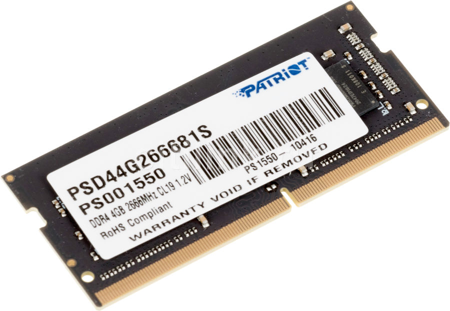 Оперативная память SODIMM Patriot Signature Line [PSD44G266681S] 4 ГБ выполнена в форм-факторе SODIMM, что позволяет применять ее в ноутбуке с поддержкой памяти DDR4 и наличием незанятого слота под модуль ОЗУ. Использовать эту одиночную планку объемом 4 ГБ стоит в том случае, если быстродействие вашего ноутбука больше не устраивает вас. Память с пропускной способностью PC21300 и возможностью работы с тактовой частотой 2666 МГц может выступать средством модернизации портативного компьютера. Если в ноутбуке используется модуль ОЗУ с худшими показателями эффективности, вы сможете установить планку вместо него. Оперативная память SODIMM Patriot Signature Line [PSD44G266681S] снабжается 16 чипами памяти, установленными по обеим сторонам платы из черного текстолита. Планка рассчитана на работу при напряжении питания на входе 1.2 В. Она имеет тайминги 19-19-19-43 и отличается малым энергопотреблением.