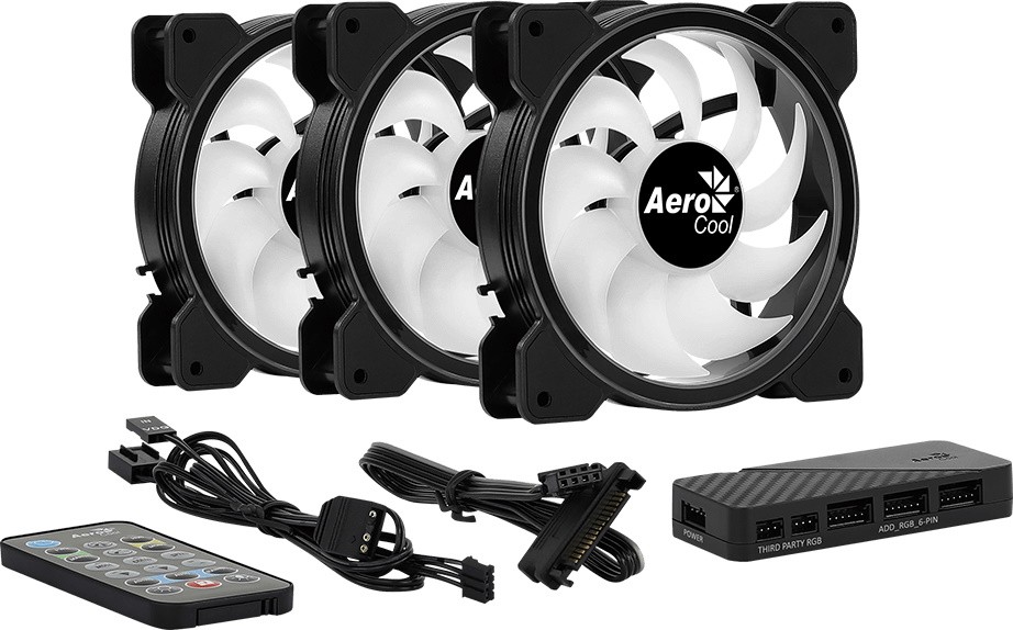 Aerocool Saturn 12F ARGB Pro 3 pcs + HUB - комплект, состоящий из трёх 120 мм вентиляторов с 6-контактным разъемом, оснащенных многоцветными RGB-светодиодами.