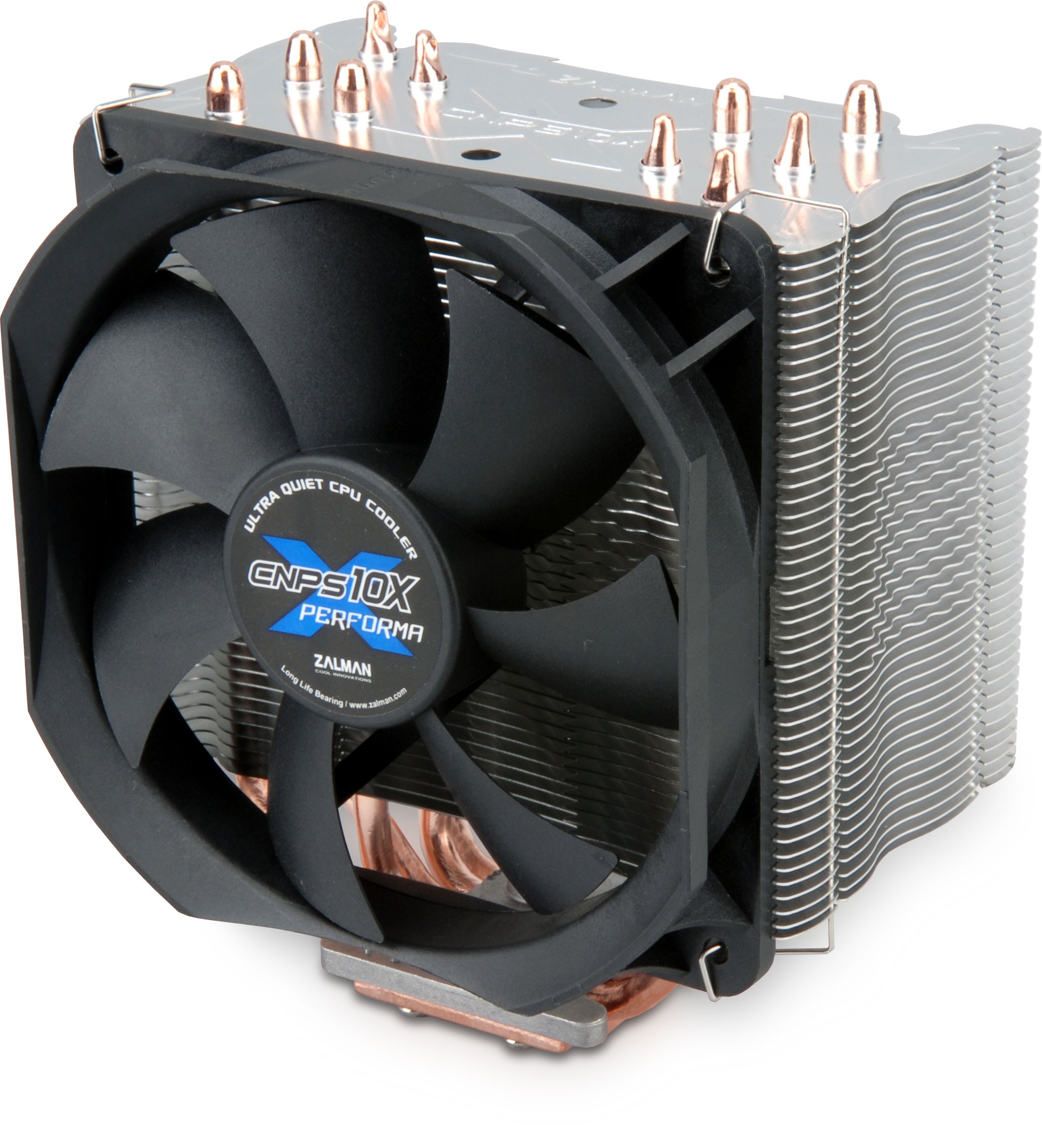 Кулер для процессора Zalman CNPS10X Performa может устанавливаться на большинство сокетов компаний Intel и AMD. Он отличается эффективным охлаждением процессора благодаря реализации удачных конструктивных решений. Используется башенная схема компоновки: к медному основанию припаяны 5 медных U-подобной формы тепловых трубок диаметром 5 мм, на которые посажены 47 тонких алюминиевых пластин с зазором 2.4 мм. Тепловые трубки в радиаторе расположены в шахматном порядке, это способствует их лучшему обдуву и равномерной передаче теплового потока от процессора на пластины радиатора. Средние 15 ребер радиатора имеют волнообразную форму, снижающую сопротивление воздушному потоку и уменьшающую шум.Вентилятор кулера Zalman CNPS10X Performa (его габариты 120x120x25 мм) выполнен на шарикоподшипнике качения, имеющем больший ресурс, нежели подшипники скольжения. Скорость вращения вентилятора автоматически меняется сообразно нагрузке процессора в диапазоне от 900 до 2000 об/мин (используется разъем 4-pin).