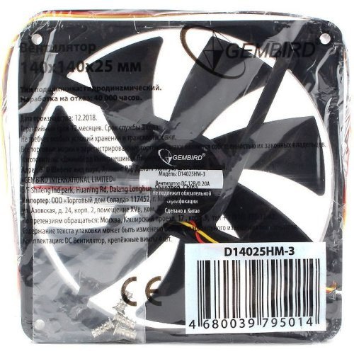 Вентилятор 140 х 140 х 25 мм, Gembird D14025BM-3. Вентилятор питается от 12В, имеет датчик оборотов и подключается к 3-pin коннектору. В нем используется подшипник качения, что обеспечивает пониженный уровень шума и увеличивает ресурс работы вентилятора.