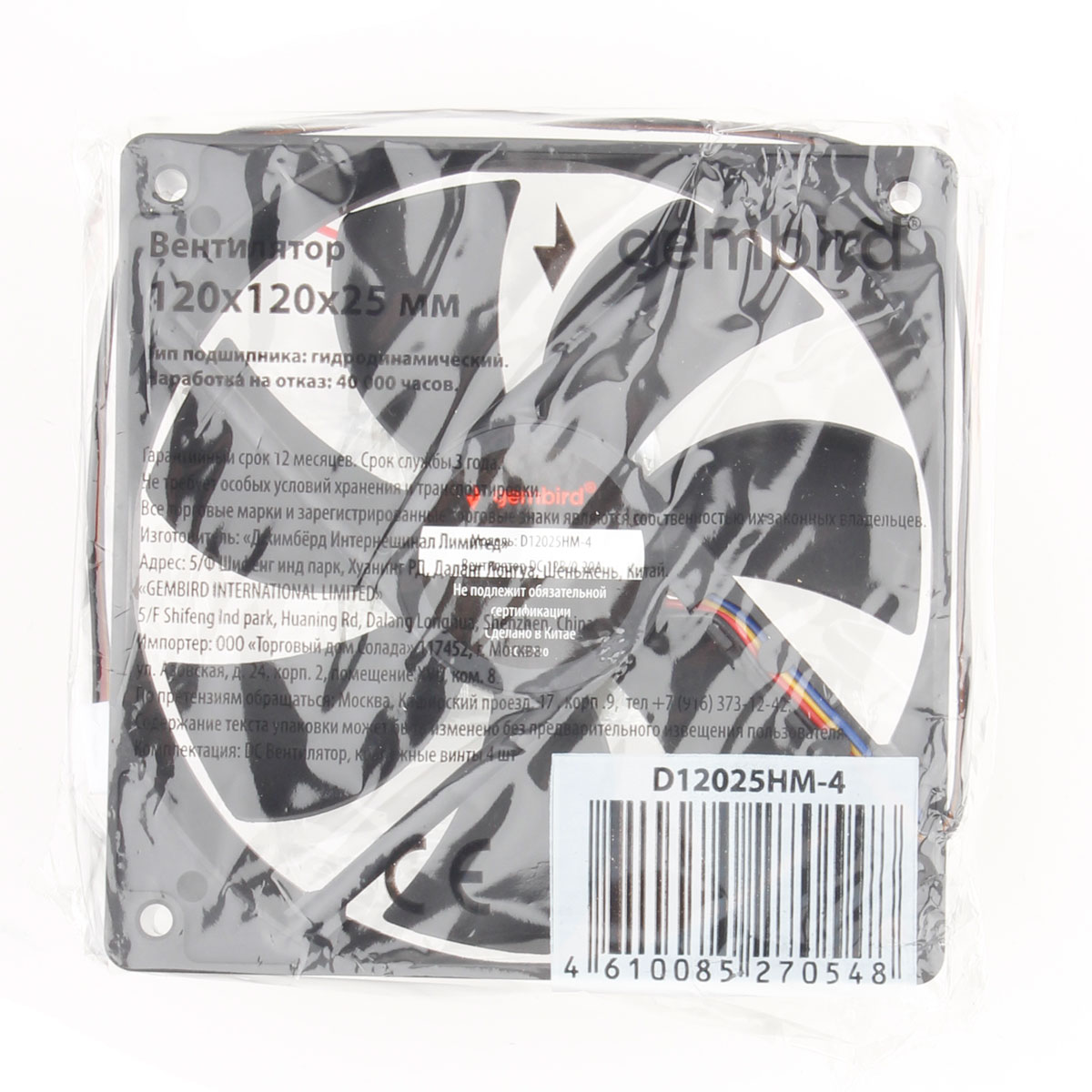 Вентилятор 120 х 120 х 25 мм, Gembird D12025HM-4 питается от 12В, имеет датчик оборотов и подключается 4-pin коннектору. Благодаря использованию гидродинамического подшипника вентилятор обладает увеличенным ресурсом работы до 40 000 ч.